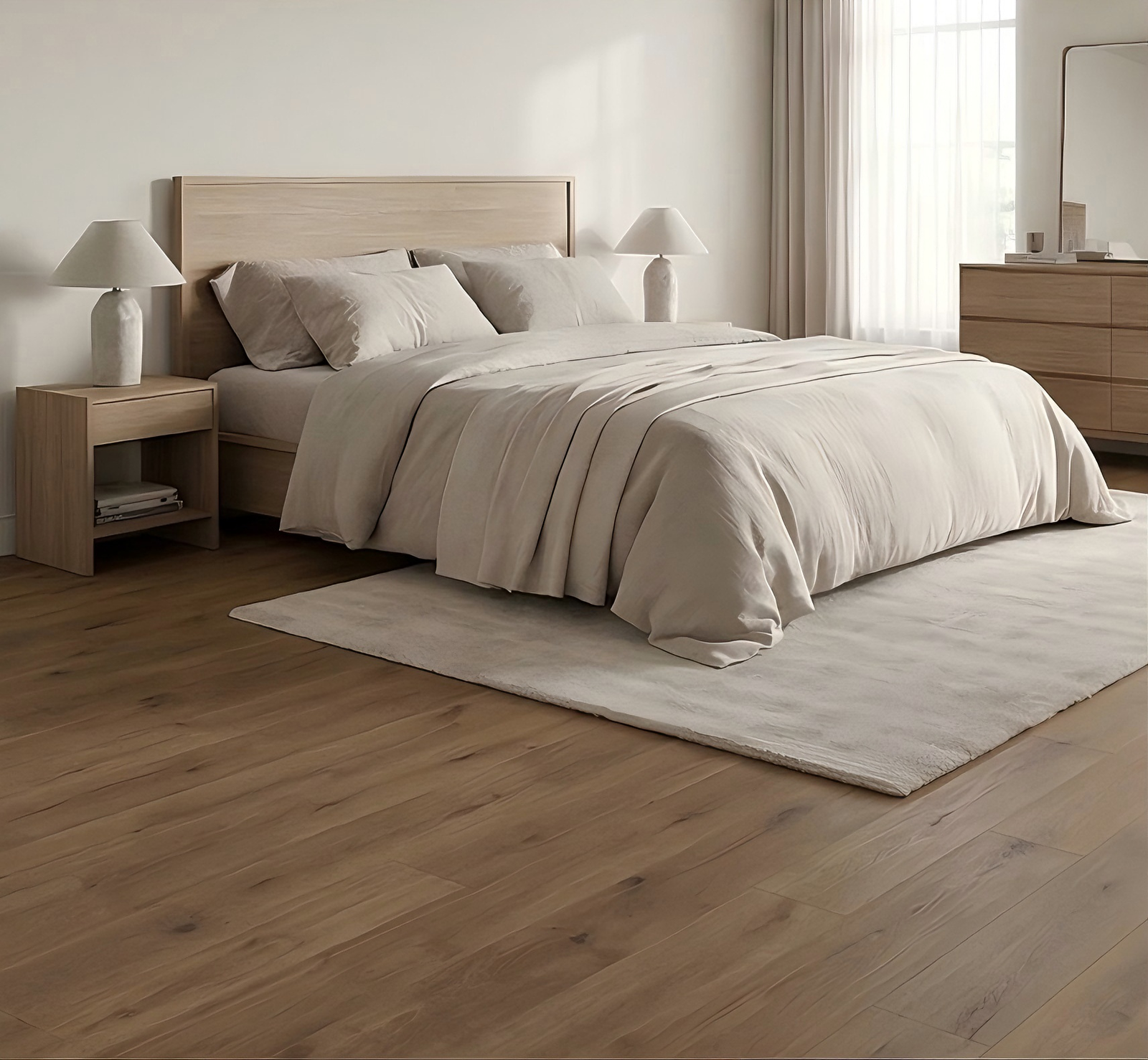 Warm wood tones help create a softer, more relaxed bedroom atmosphere with everyday durability.